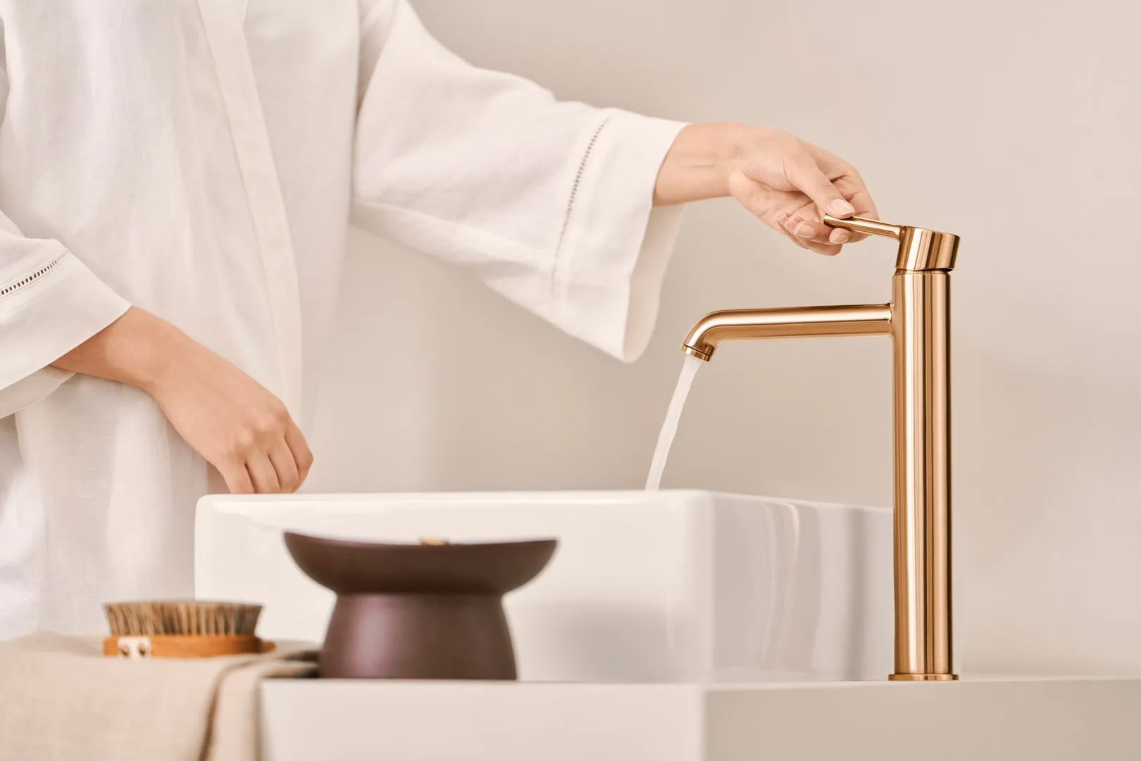 Für gehobene Designansprüche steht HANSAVANTIS STYLE zur Verfügung. Die Design-Armatur besticht durch ihre puristische und zeitlos elegante Erscheinung. In fünf Optionen und den vier Oberflächenvarianten Brushed Bronze, Brushed Steel, Chrome und Matt Black lässt sie sich perfekt in anspruchsvolle Badplanungen einsetzen. Je nach persönlichen Vorlieben als solitärer Blickfang oder perfekt integrierter Begleiter eines harmonischen Gesamt-Ensembles.